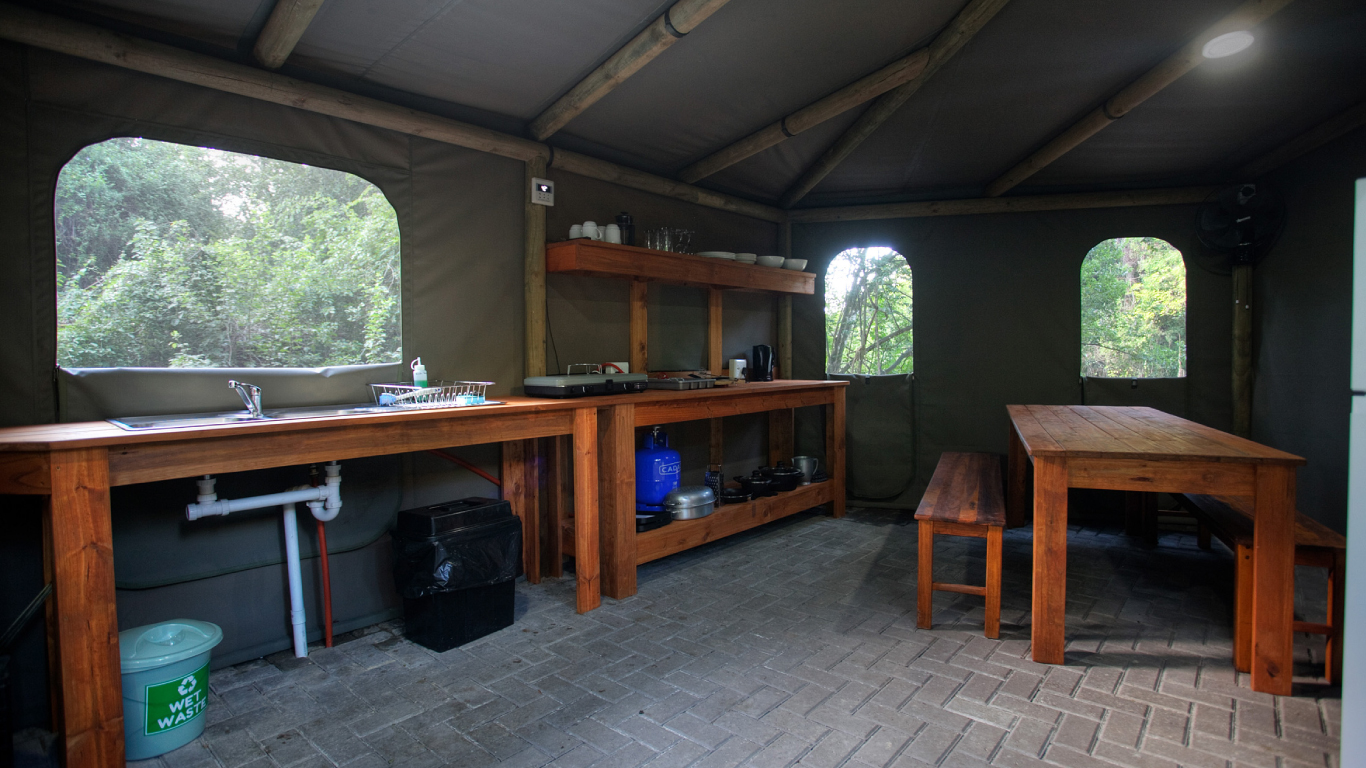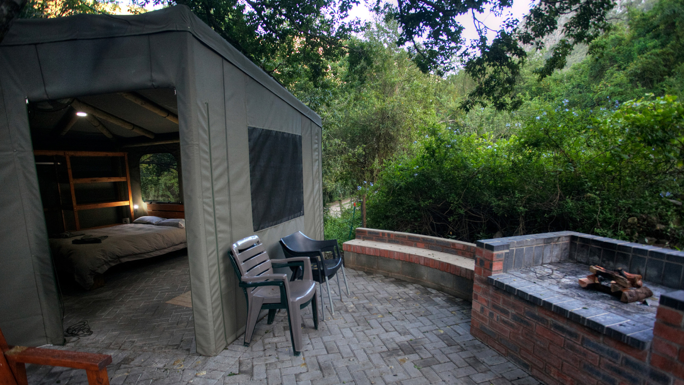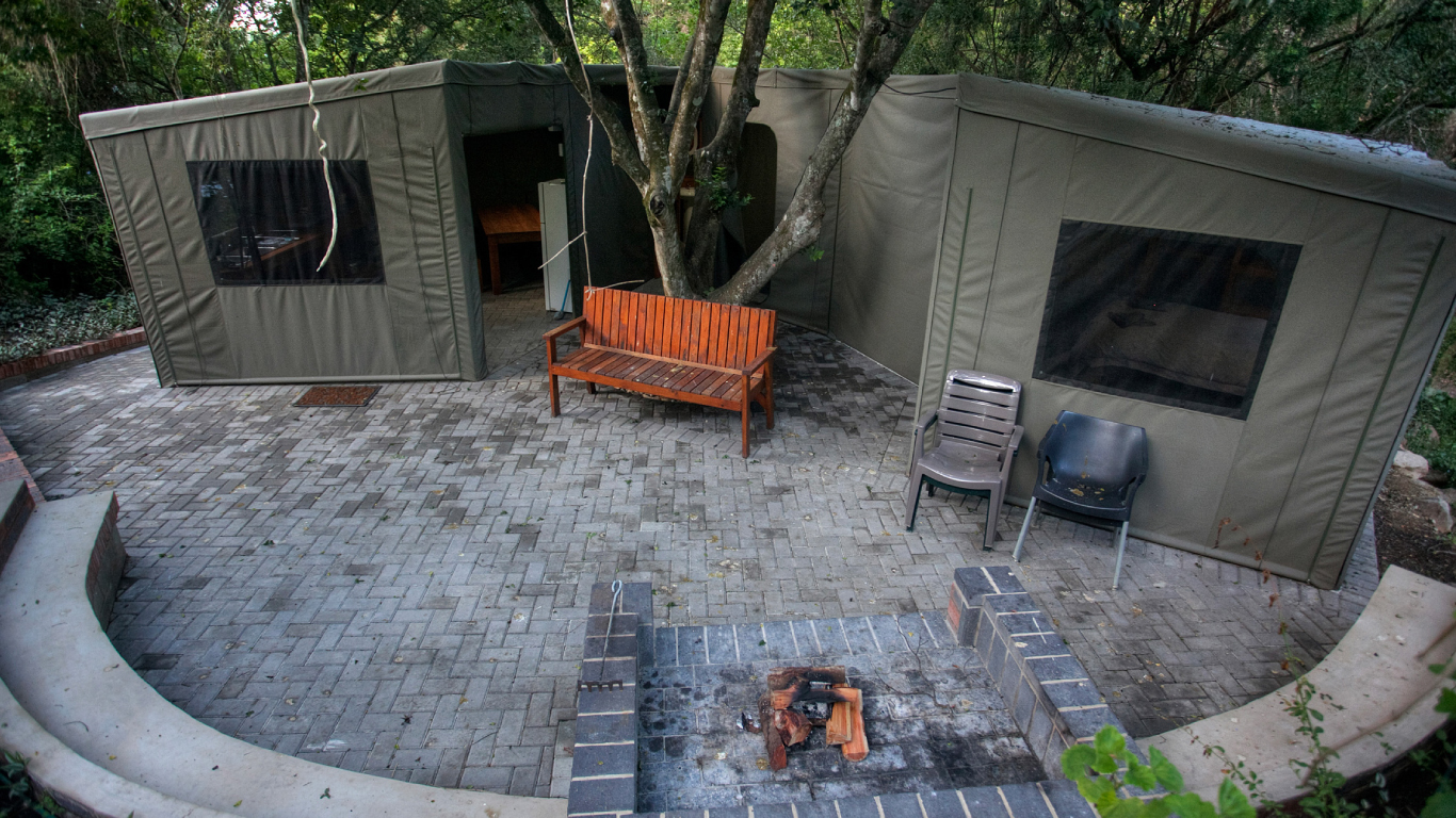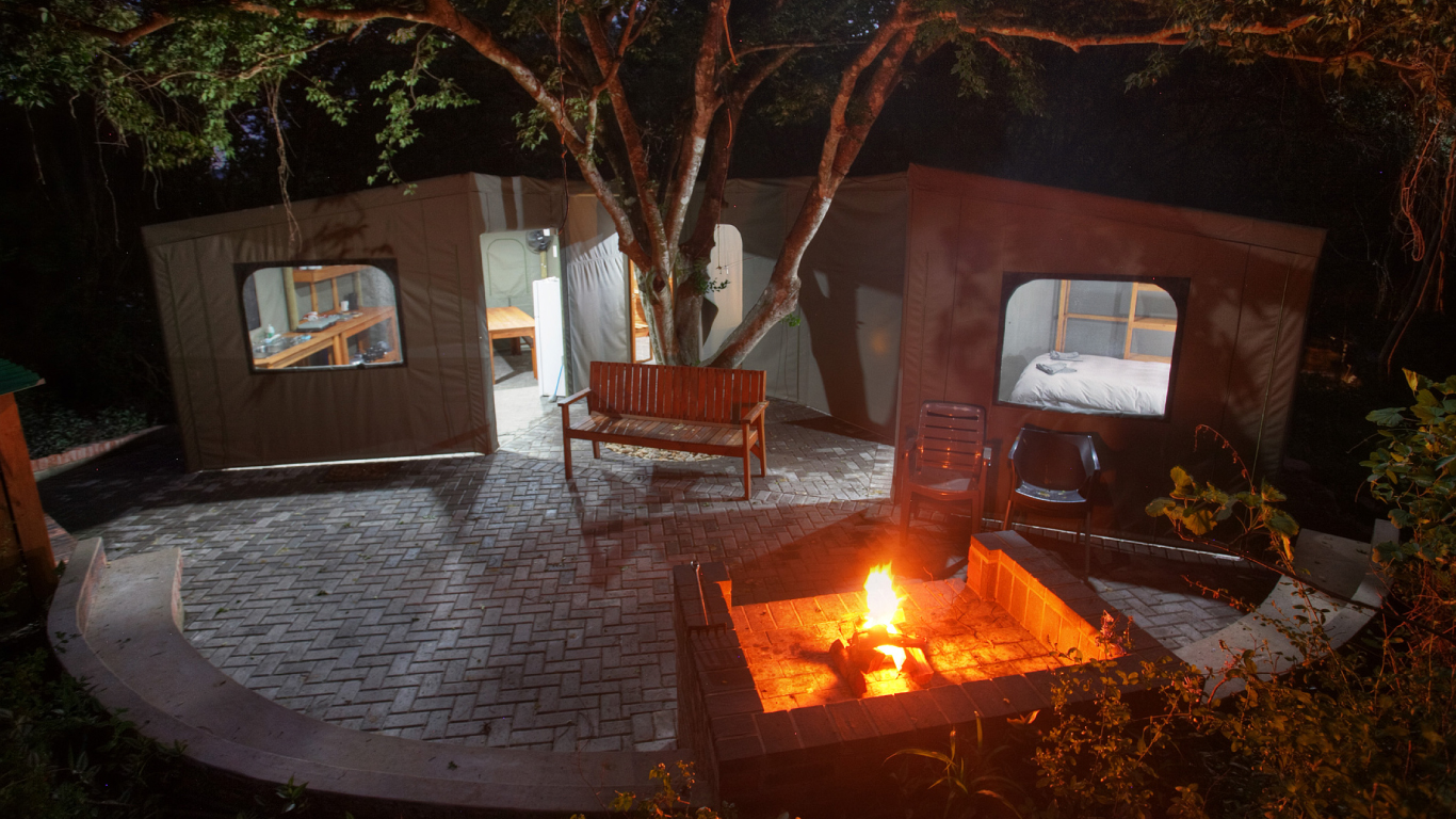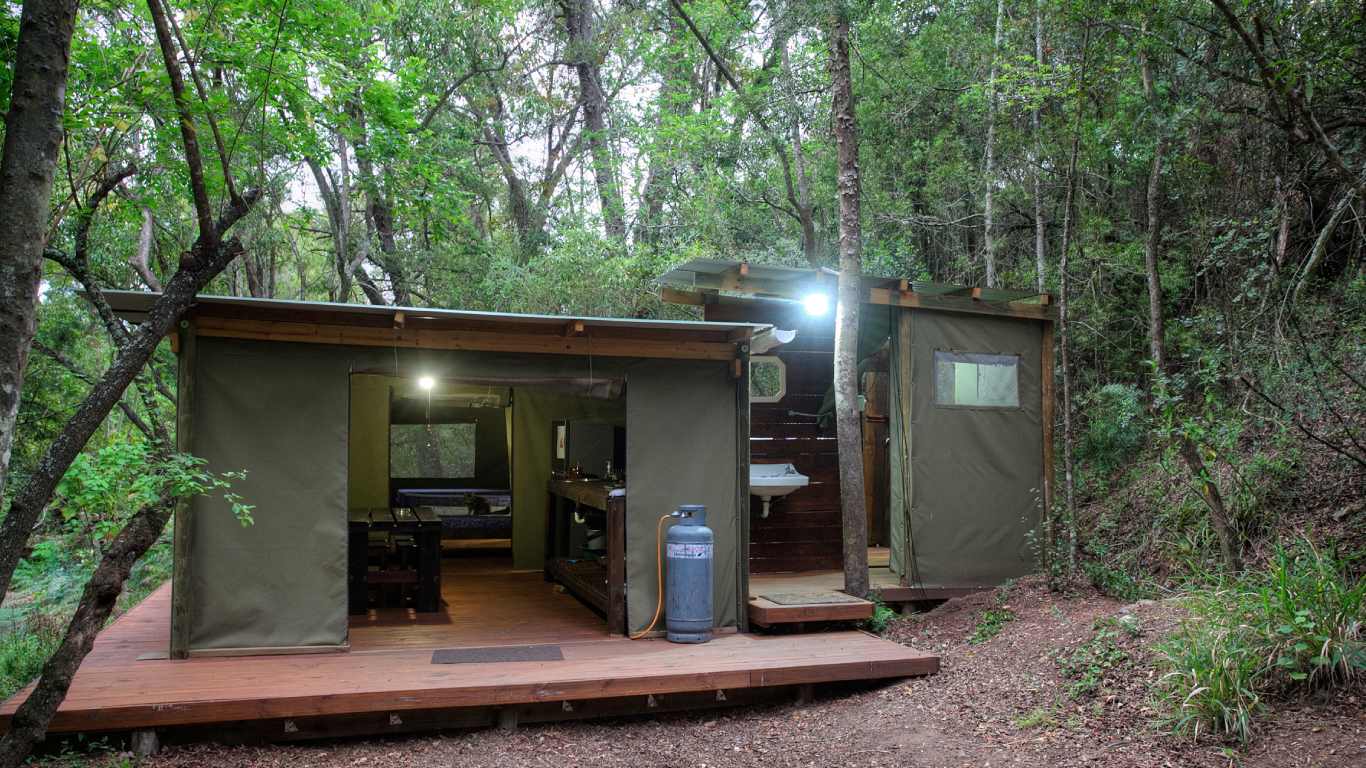 The four tents are located in indigenous bush under huge yellow wood trees next to a stream it is the ideal spot to relax away from the normal hustle and bustle.
